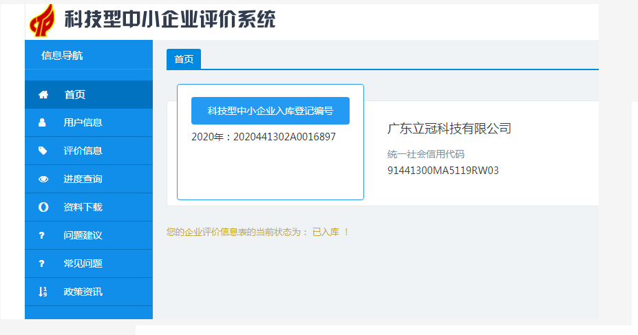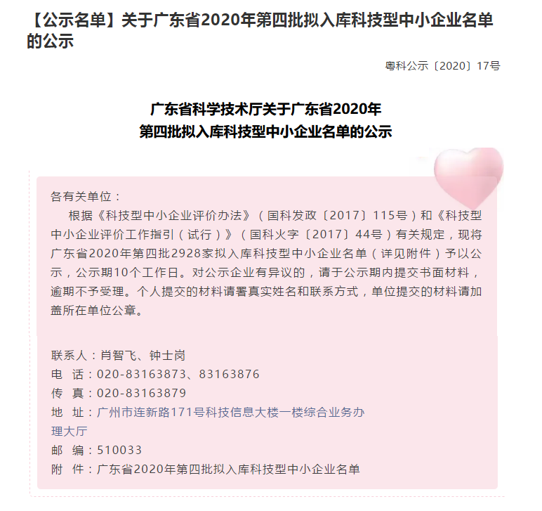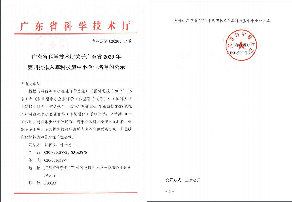 热烈祝贺公司入选《广东省科学技术厅2020年第四批入库科技型中小企业名单》