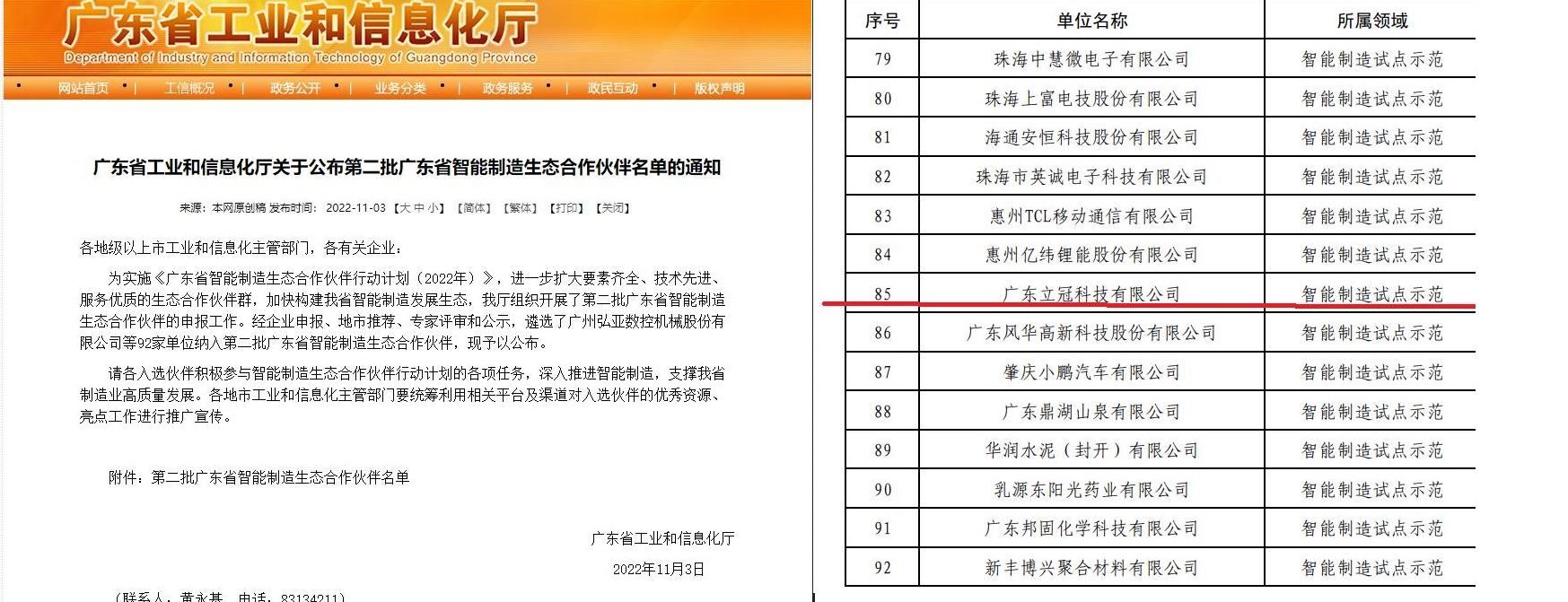 2022年11月3日,广东省工业和信息化厅公布了第二批广东省智能制造生态合作伙伴名单,立冠科技携手TCL移动通信、亿纬锂能、华阳多媒体共四家企业入选名单,这是对公司多年以来高强度的研发投入以及产品线扩展布局成果的体现,在此向长期从事研发的同事表示深深的感谢!