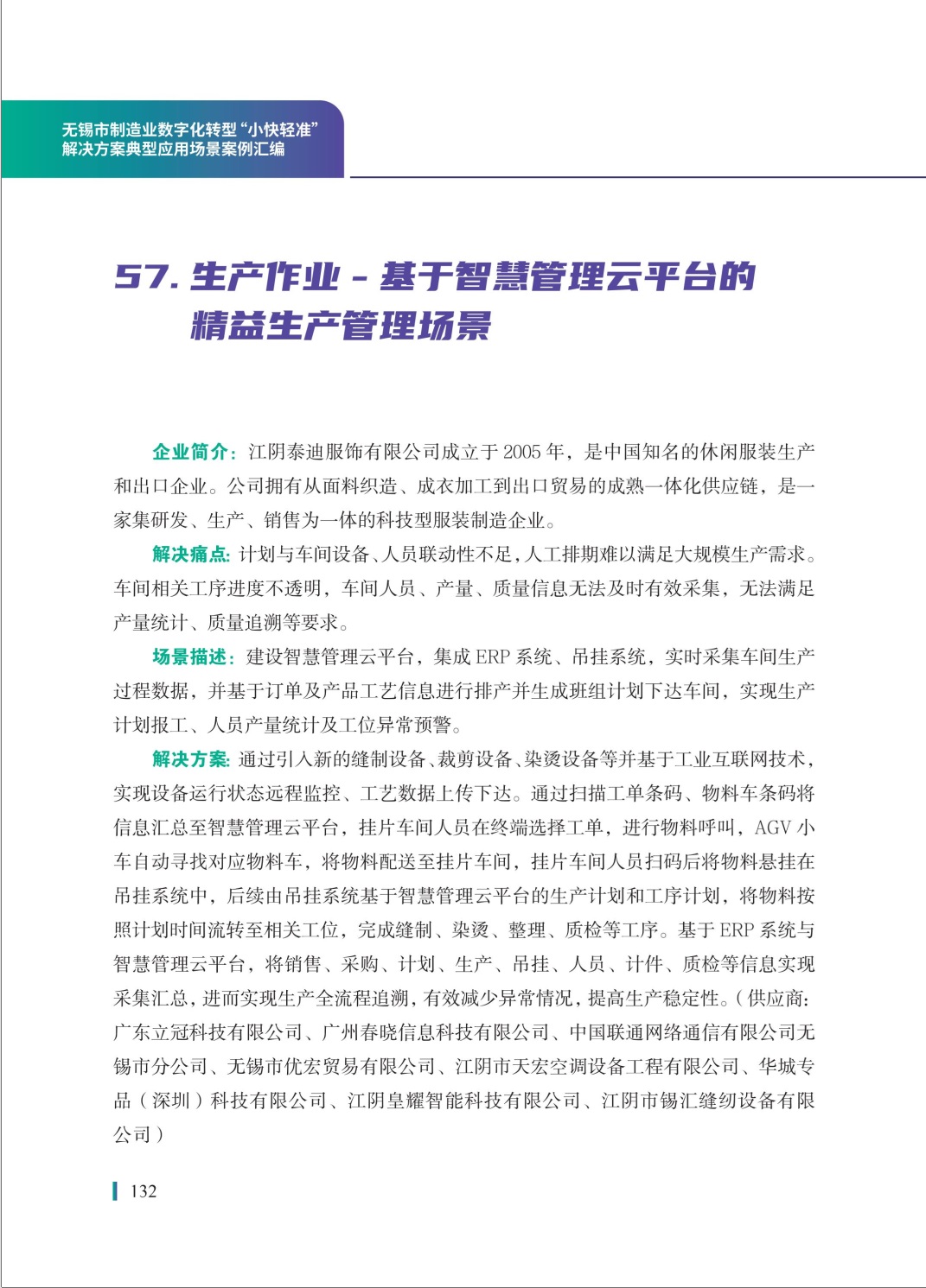 近日,立冠科技在江苏省内为无锡利安达集团旗下的江阴泰迪服饰有限公司打造的5G智慧工厂项目获得《无锡市制造业数字化转型“小快轻准”解决方案典型案例汇编》收录,本项目的成功也是公司在智能化项目开展过程中重要的里程碑,同时,公司其他领先行业的科技项目也在有序的推进中